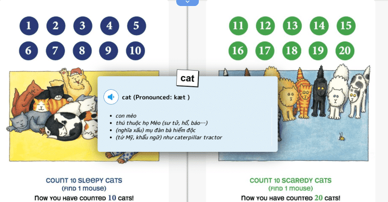 Đặc biệt hơn là tính năng từ điển được tích hợp tại đây. Phụ huynh và các bé chỉ cần click vào từ vựng bất kì từ điển sẽ hiện lên ngay lập tức bao gồm từ tiếng Anh, phiên âm và nghĩa tiếng Việt, rất hiệu quả cho các bé ghi nhớ những từ vựng mới và đọc theo giọng đọc dưới sự hướng dẫn của phụ huynh.