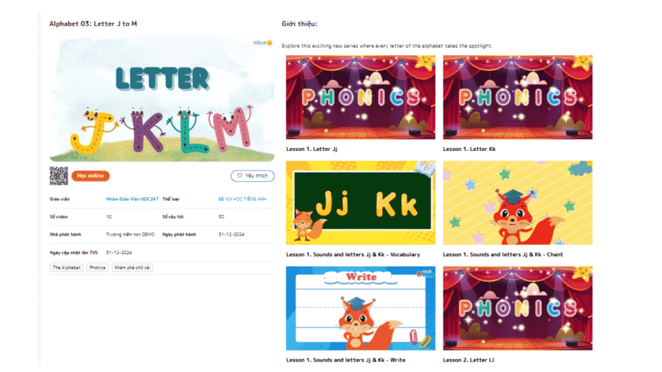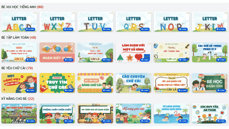 Các video được sắp xếp khoa học theo từng nhóm nội dung như: Bé vui học Tiếng Anh, Bé tập làm Toán, Bé yêu chữ cái, Kỹ năng cho bé, Khoa học kỳ thú,... Nhờ cách phân loại rõ ràng, phụ huynh và giáo viên có thể dễ dàng lựa chọn video phù hợp với độ tuổi và nhu cầu học tập của trẻ.